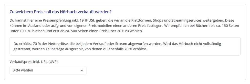 Hast du bereits eine Idee, zu welchem Preis dein Hörbuch verkauft werden sollte? Orientiere dich bei der Wahl deiner Preisempfehlung an dem Markt und schaue nach, was die Hörbücher kosten, deren Printversionen eine ähnliche Länge haben wie dein Buch oder Hörbücher, die demselben Genre anhören. Achtung: Hörbücher sind nicht preisgebunden – Plattformen können dein Hörbuch deshalb zu eigenen Preisen anbieten. Bei Abomodellen kann es sein, dass deine gewählte Empfehlung gar nicht angezeigt wird.